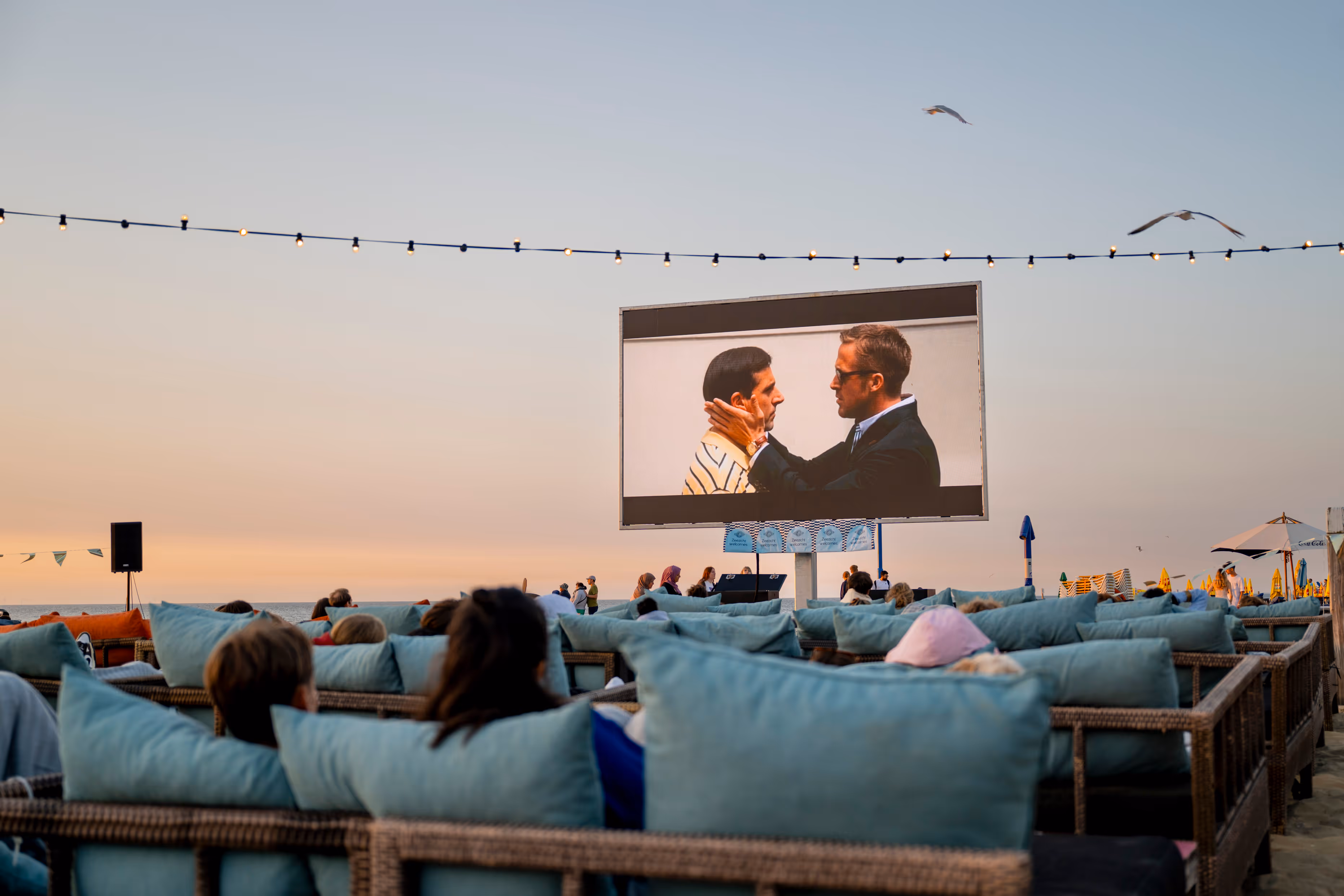 In de avond verandert ons strand in een openluchtbioscoop zoals je die alleen bij ons op Scheveningen vind. Je ligt op je eigen luxe loungebed, terwijl de lucht oranje kleurt en je knus onder een dekentje kruipt. Op de achtergrond ruist de zee, de film begint, en wij brengen je een cocktail. Dit is de Strandbioscoop van Zeezicht.